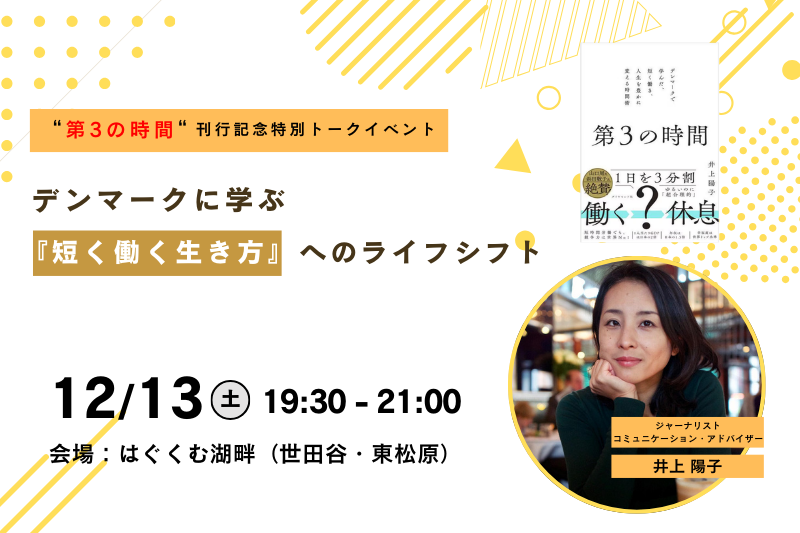 そんな問いをテーマに、デンマーク在住のジャーナリスト、井上陽子さんの新刊『第3の時間:デンマークで学んだ、短く働き、人生を豊かに変える時間術』(ダイヤモンド社)の来日トークイベントを開催します。